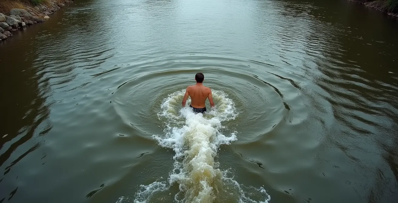 En piscine, l’eau est immobile. En rivière, elle est un tapis roulant dont la vitesse et la direction cachent des pièges mortels. Le nageur moyen pense qu’il suffit de lutter contre le courant principal. L’erreur est là : les dangers les plus graves sont souvent les courants secondaires. Apprendre la « lecture de l’eau » est une nécessité absolue. Une surface d’apparence lisse peut masquer un « siphon », où l’eau s’engouffre sous un rocher avec une force colossale. Ce phénomène, un véritable effet Venturi fluvial, ne laisse aucune chance, même au champion olympique. Les signes à repérer sont subtils : une eau qui semble « aspirée » à la base d’un rocher, ou une ligne de courant qui disparaît brusquement.
